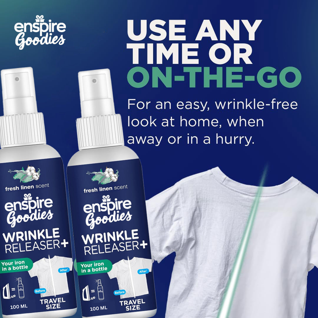 First, spray liberally over the wrinkled areas and wait for about 30 seconds. Then, tug or stretch the garment using your hands to further release the tension. Lastly, wipe the wrinkle away using you hand or a cloth.